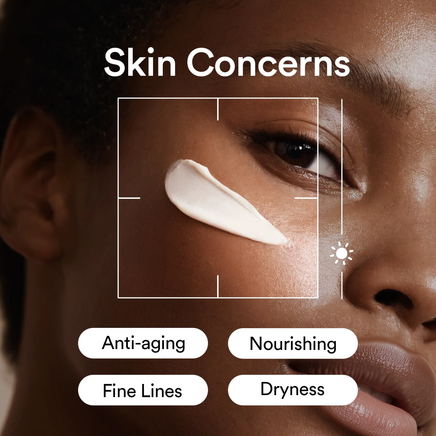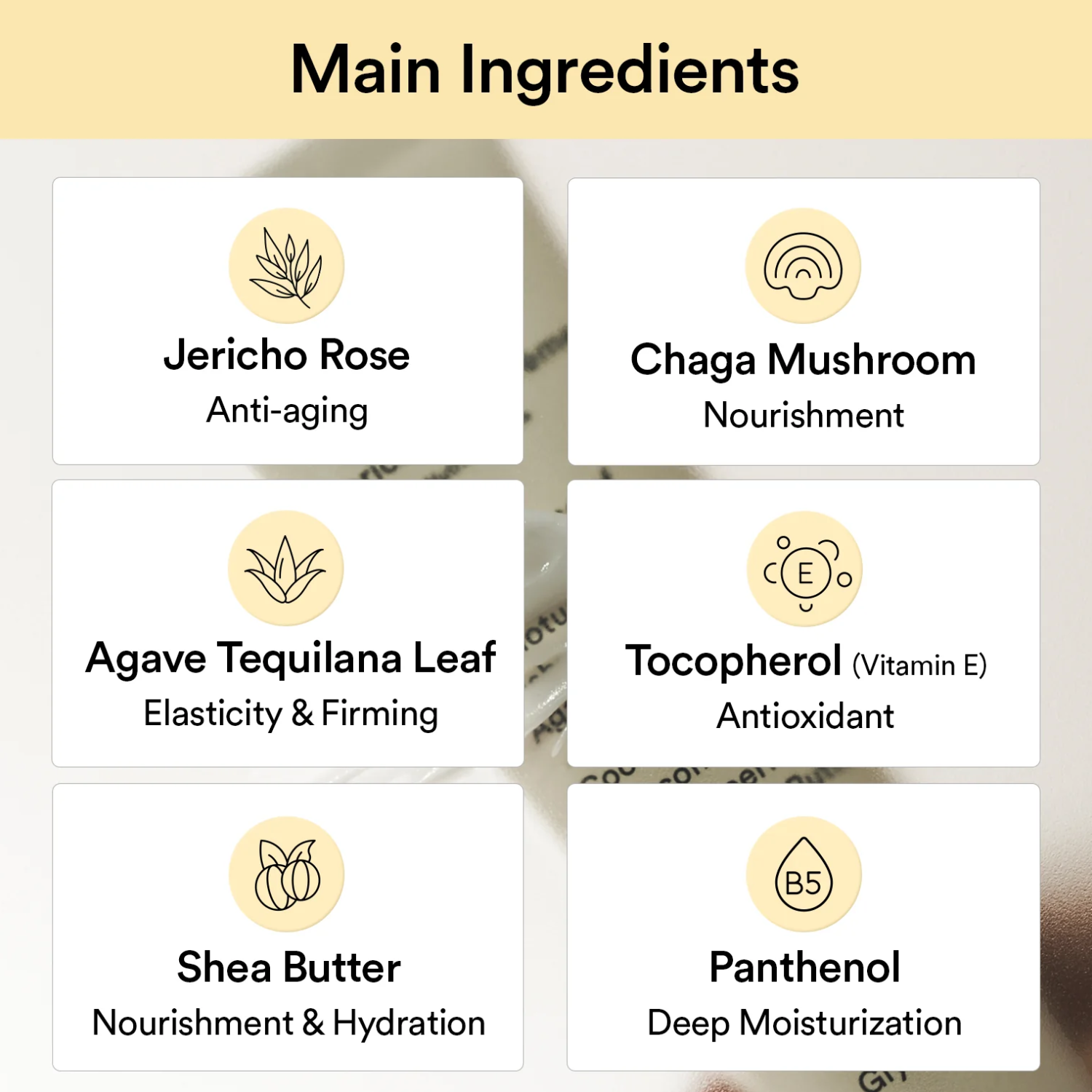 Ingredients: Water (Aqua), Butylene Glycol, Glycerin, Caprylic/Capric Triglyceride, Diisostearyl Malate, Cocos Nucifera (Coconut) Oil, Butyrospermum Parkii (Shea) Butter, Cetearyl Alcohol, Diglycerin, Pentylene Glycol, 1,2-Hexanediol, Bis-Diglyceryl Polyacyladipate-2, Caprylic/Capric/Myristic/Stearic Triglyceride, Isotridecyl Isononanoate, Arachidyl Alcohol, Panthenol, Synthetic Beeswax, Vinyl Dimethicone, Anastatica Hierochuntica Extract, Jojoba Esters, Behenyl Alcohol, Glyceryl Stearate, Arachidyl Glucoside, Hydroxyethyl Acrylate/Sodium Acryloyldimethyl Taurate Copolymer, C12-16 Alcohols, Acrylates/C1030 Alkyl Acrylate Crosspolymer, Palmitic Acid, Tromethamine, Copernicia Cerifera (Carnauba) Wax, Hydrogenated Lecithin, Lactobacillus Ferment, Dipotassium Glycyrrhizate, Xanthan Gum, Ethylhexy-Iglycerin, Adenosine, Trisodium Ethylenediamine Disuccinate, Tocopherol, Inonotus Obliquus (Mushroom) Extract, Methylpropanediol, Agave Tequilana Leaf Extract.
