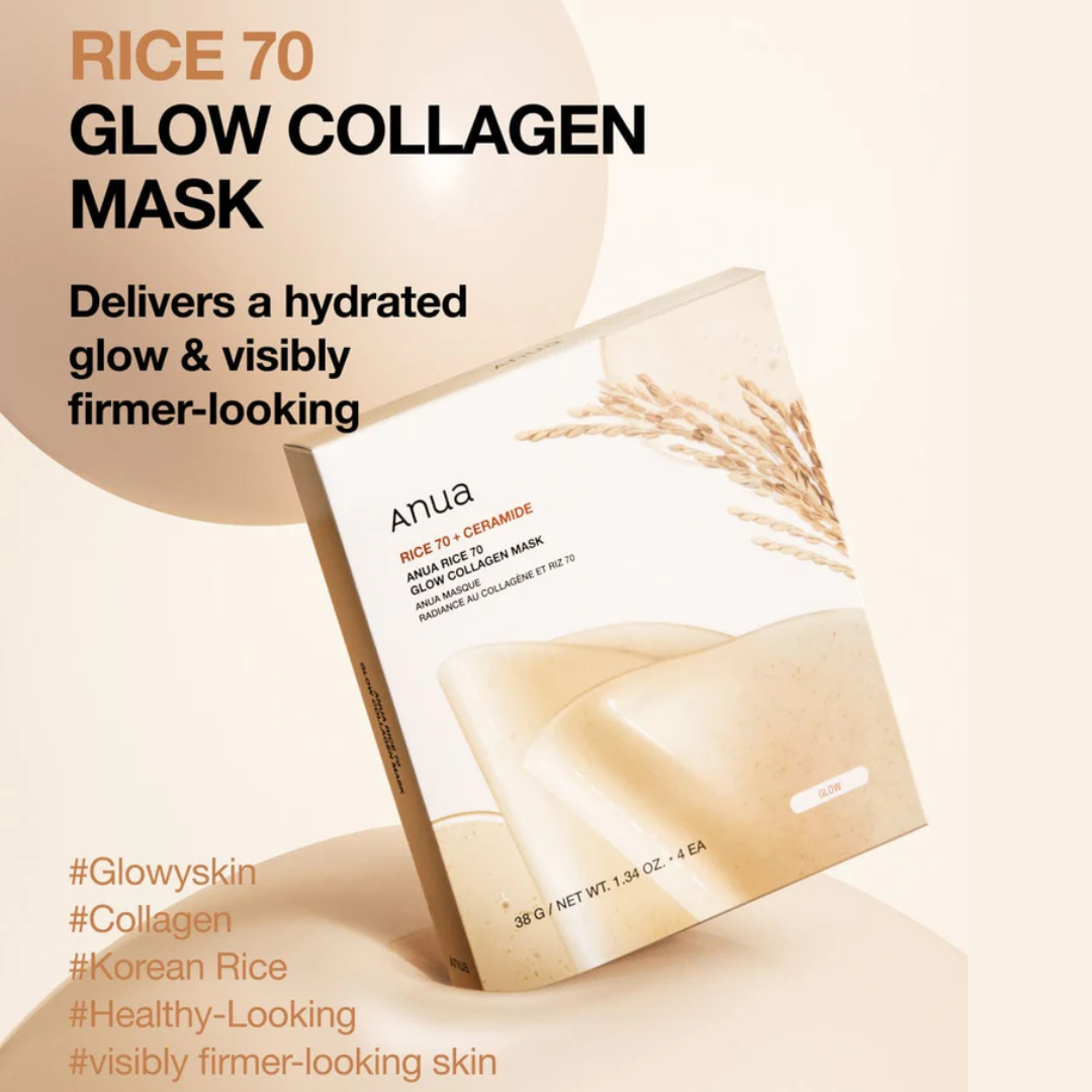 Revitalize your skin with the ANUA Rice 70 Glow Collagen Mask. Infused with Hyaluronic Acid and Ceramide NP, this mask deeply hydrates and strengthens your skin's barrier, leaving your complexion smooth and glowing. Suitable for all skin types, it helps achieve a radiant and youthful appearance. For best results, apply after your toner, serum, and cream, and leave it on for at least 3 hours or overnight for maximum hydration.