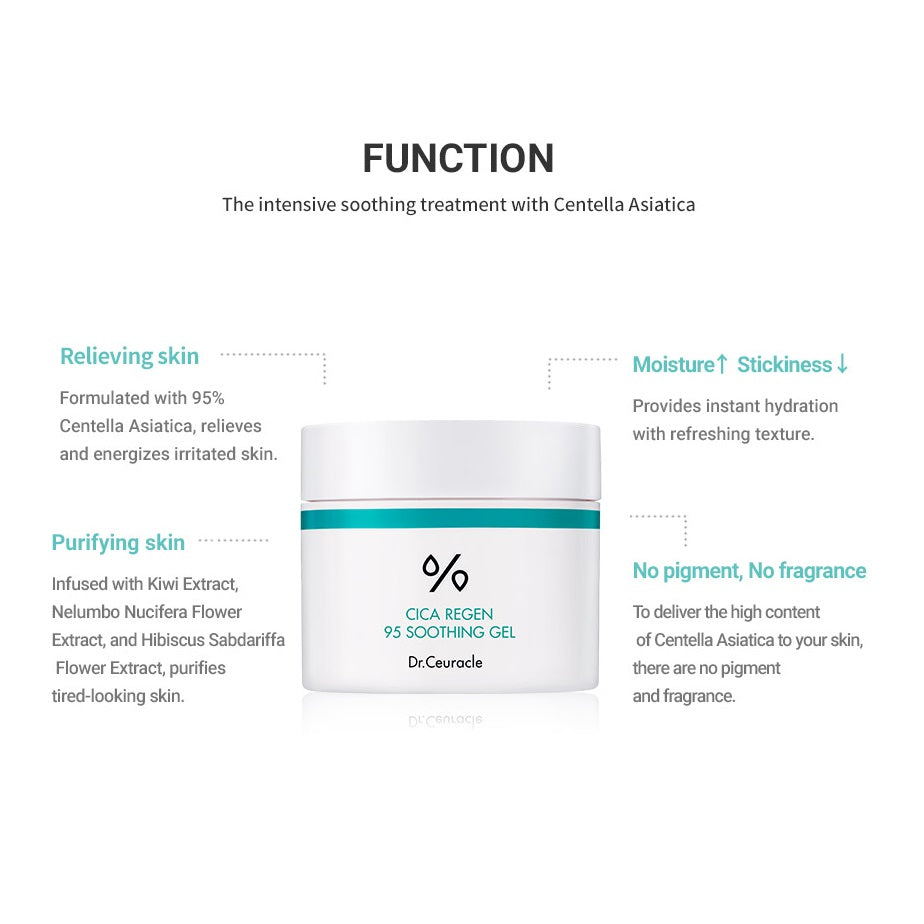 DR. CEURACLE Cica Regen 95 Soothing Gel is a lightweight gel designed to calm irritated and sensitive skin. With 95% Centella Asiatica Extract, it helps reduce redness and promotes healing while strengthening the skin barrier. Its fast-absorbing formula provides long-lasting hydration without stickiness, making it perfect for all skin types. Simply apply evenly to sensitive areas and gently pat for absorption.