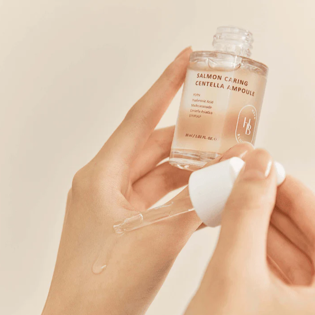 Introducing HEVEBLUE Salmon Caring Centella Ampoule, a soothing and hydrating serum perfect for sensitive skin. Formulated with Centella Asiatica Leaf Water and Salmon Egg Extract, it calms irritation and boosts moisture for a refreshed complexion. Lightweight yet nourishing, it helps strengthen and repair your skin. After toning, simply apply a small amount and gently tap to enhance absorption.