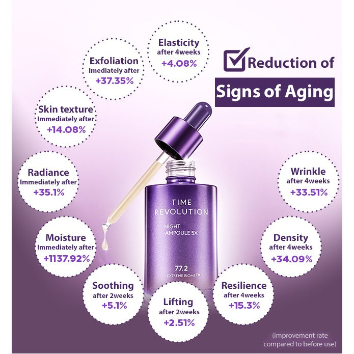 Transform your skin overnight with MISSHA Time Revolution Night Repair Ampoule 5X. This powerful serum enhances texture, firmness, and radiance while you sleep, thanks to skin-loving ingredients like Bifida Ferment Lysate and Niacinamide. Antioxidant-rich extracts, including Blueberry and Carrot, support skin recovery and hydration. For best results, apply a generous amount after toner and pat lightly for full absorption.