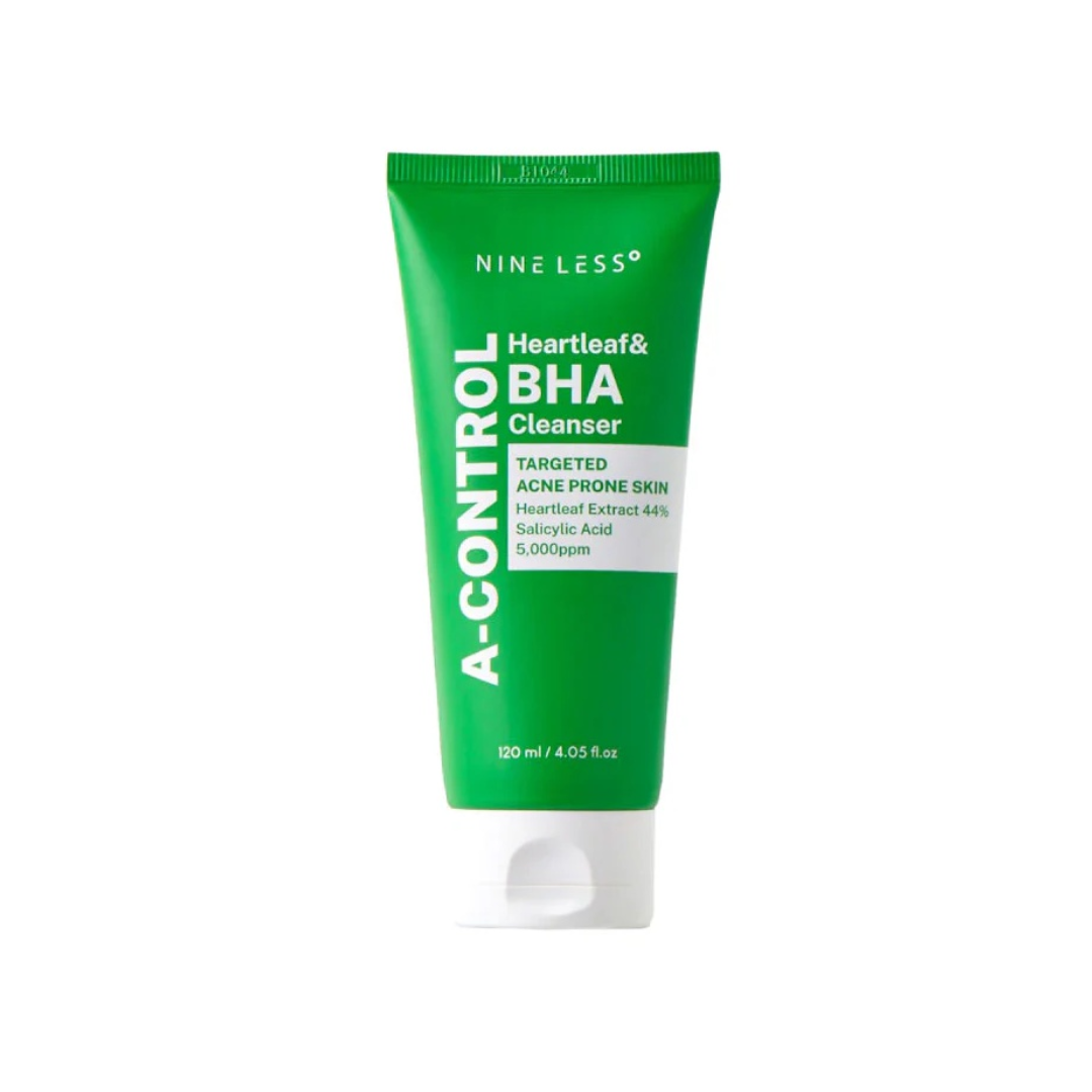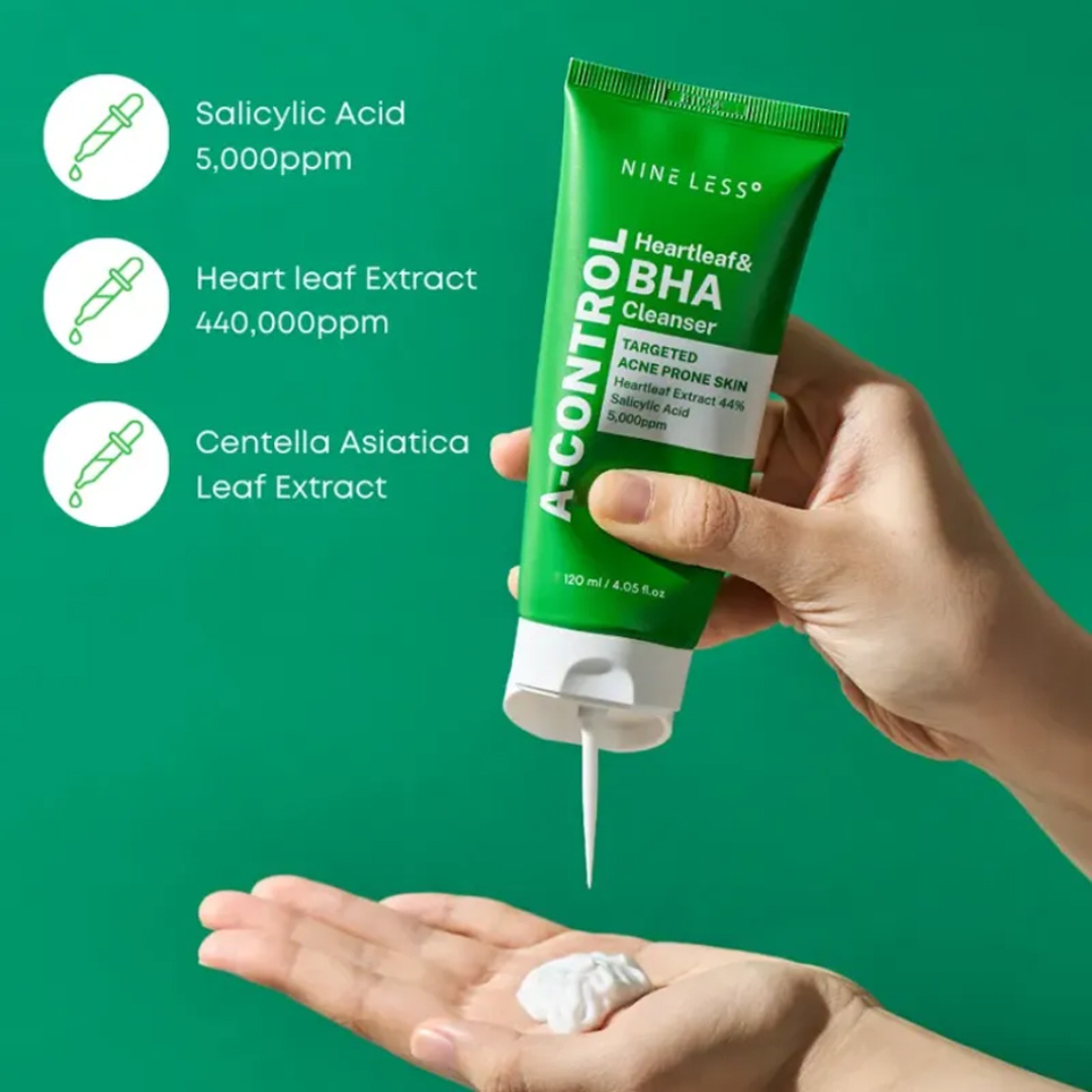 NINELESS A-Control Heartleaf & BHA Cleanser is specially designed for oily and acne-prone skin. This powerful formula deeply cleanses pores, reduces breakouts, and controls oil production, leaving your skin refreshed and clear. Enriched with soothing ingredients like Willow Bark and Green Tea Extract, it protects without stripping moisture. To use, simply wet your face, apply the lather, focus on breakout-prone areas, and rinse.