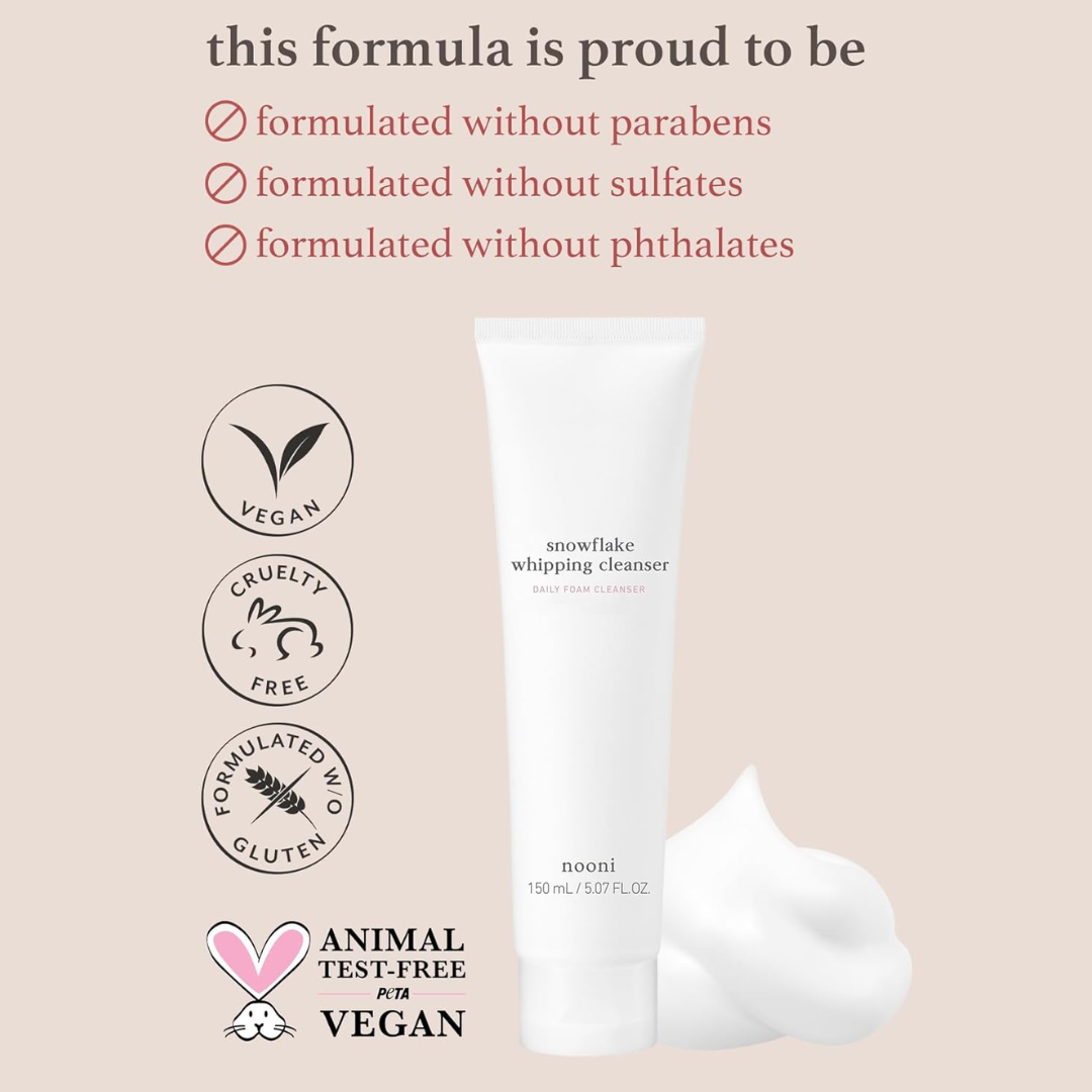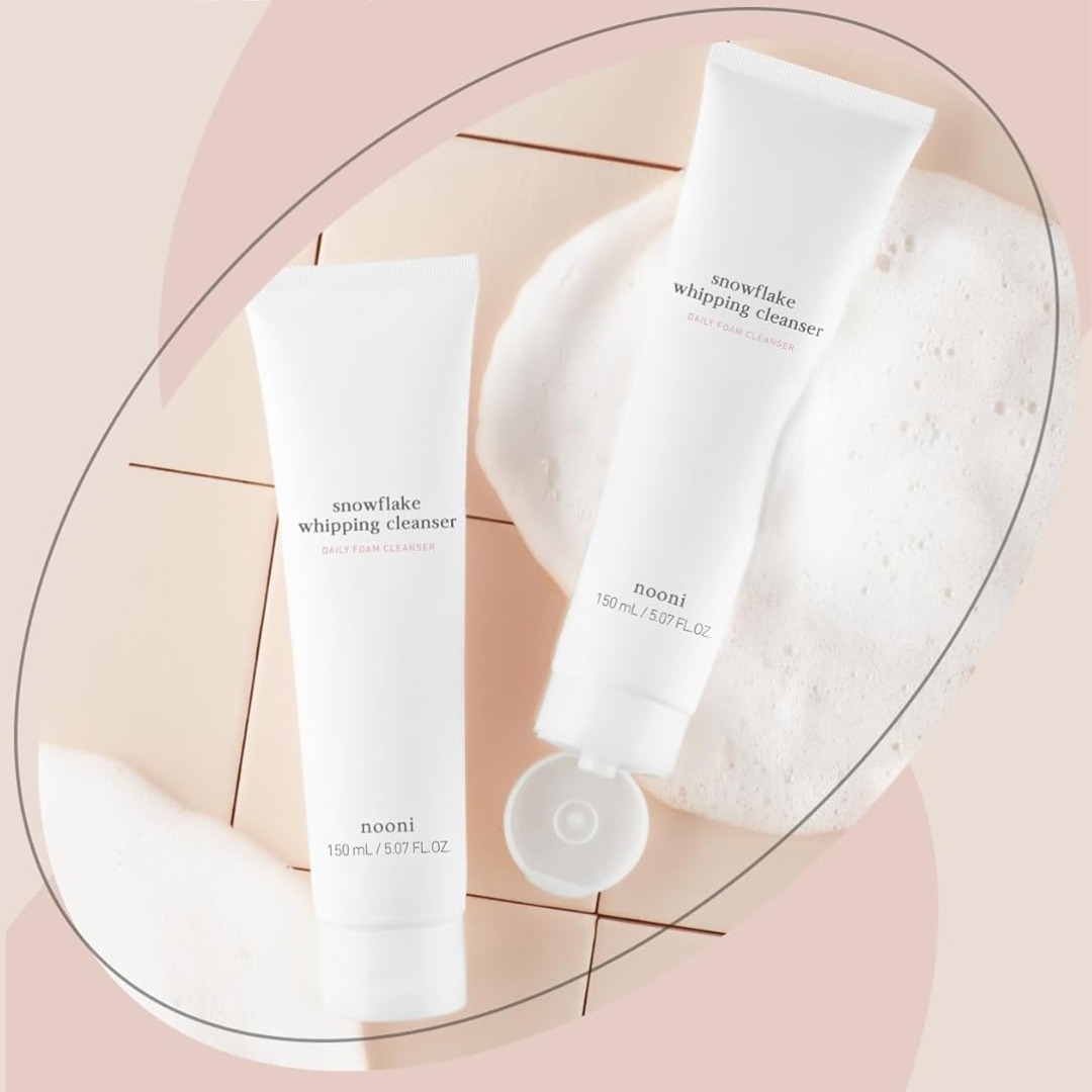 Experience the gentle cleansing power of NOONI Snowflake Whipping Cleanser. Its creamy, whipped texture effectively removes impurities and makeup while keeping your skin soft and hydrated. Infused with soothing extracts like Althaea Officinalis Root and Saussurea Involucrata, it calms and nourishes your skin. Suitable for all skin types, simply massage the foam onto a damp face for 10-15 seconds and rinse with lukewarm water for a refreshed, radiant complexion.