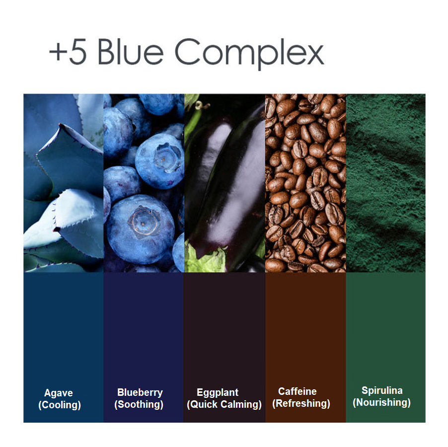 Ingredients: Water, Glycerin, Calcium Chloride, Ceratonia Siliqua (Carob) Gum, Xanthan Gum, Butylene Glycol, Butyrospermum Parkii (Shea) Butter, Ethyl Hexanediol, PEG-60 Hydrogenated Castor Oil, Citrus Grandis (Grapefruit) Seed Extract, Bambusa Textilis Stem Extract, Pinus Palustris Leaf Extract, Phenoxyethanol, Scutellaria Baicalensis Root Extract, Camellia Sinensis Leaf Extract, Houttuynia Cordata Extract, Artemisia Princeps Leaf Extract, Citrus Junos Fruit Extract, 1,2-Hexanediol, Caprylyl Glycol, Chondrus Crispus Powder, Synthetic Fluorphlogopite, Tin Oxide (CI 77861), Titanium Dioxide (CI 77891), Ferric Ferrocyanide (CI 77510), CI 77491, CI 77007, Chlorphenesin, Ethylhexylglycerin, Laminaria Japonica Extract, Macrocystis Pyrifera Extract, Enteromorpha Compressa Extract, Sargassum Fulvellum Extract, Spirulina Platensis Extract, Hizikia Fusiforme Extract, Codium Fragile Extract, Vaccinium Angustifolium (Blueberry) Fruit Extract, Solanum Melongena (Eggplant) Fruit Extract, Agave Americana Leaf Extract, Hydroxyethylcellulose, Disodium EDTA, Caffeine, Sapphire Powder, Fragrance.