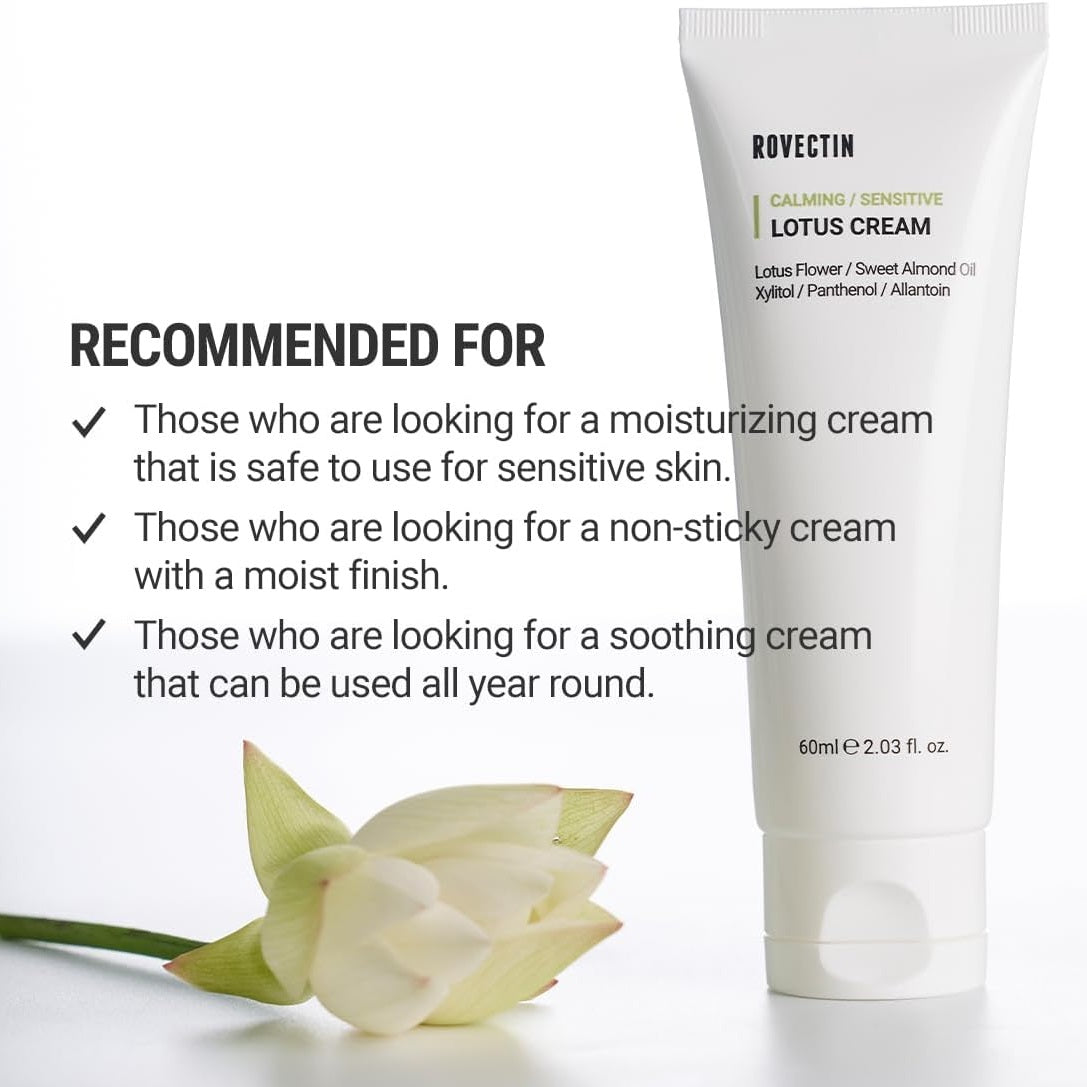 ROVECTIN Calming Sensitive Lotus Cream is a lightweight moisturizer designed for sensitive skin. It soothes irritation, strengthens the skin barrier, and provides long-lasting hydration. Infused with nourishing ingredients, it absorbs quickly, leaving your skin soft and balanced. For best results, apply after cleansing and toning, using a thicker layer if your skin feels particularly dry.