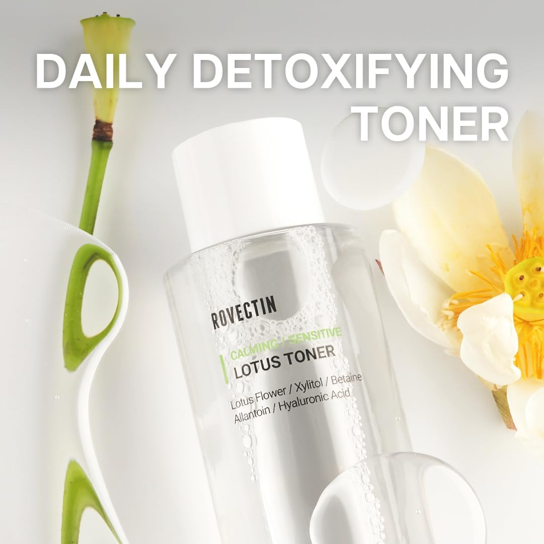 ROVECTIN Lotus Water Calming Toner is a gentle, hydrating toner designed to soothe and refresh your skin. Enriched with Hyaluronic Acid and Allantoin, it provides deep hydration while calming and nourishing sensitive skin. This lightweight formula balances moisture levels, leaving your skin smooth and revitalized. For best results, apply after cleansing using a cotton pad, day and night.