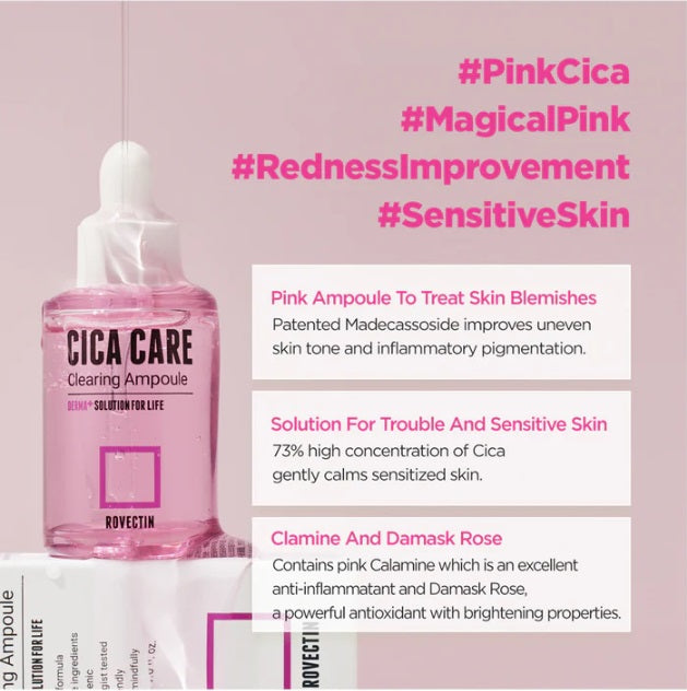 ROVECTIN Skin Essentials Cica Care Clearing Ampoule is a soothing serum that calms irritated skin and reduces redness. With a high concentration of Centella Asiatica Extract and calming Calamine, it heals sensitive and acne-prone skin. Enriched with Niacinamide and Panthenol, it brightens and deeply hydrates while strengthening the skin barrier. For best results, apply a generous amount to your face after cleansing and toning, both day and night.