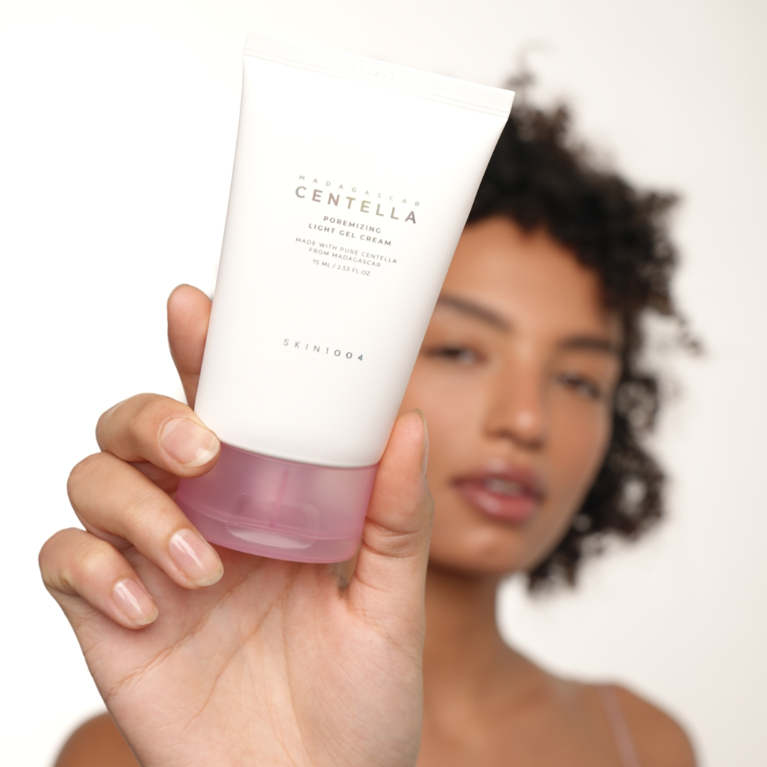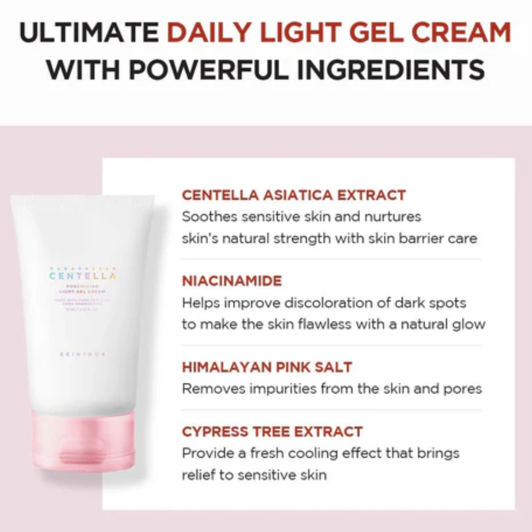 Introducing SKIN1004 Madagascar Centella Poremizing Light Gel Cream, a lightweight gel cream that hydrates while controlling oil production and minimizing pores. Infused with soothing Centella Asiatica Extract and Aloe Barbadensis Leaf Extract, it enhances skin texture and elasticity for a fresh, matte finish. Perfect for oily skin, this formula absorbs quickly without clogging pores. Simply massage into your skin as the last step of your skincare routine for best results.